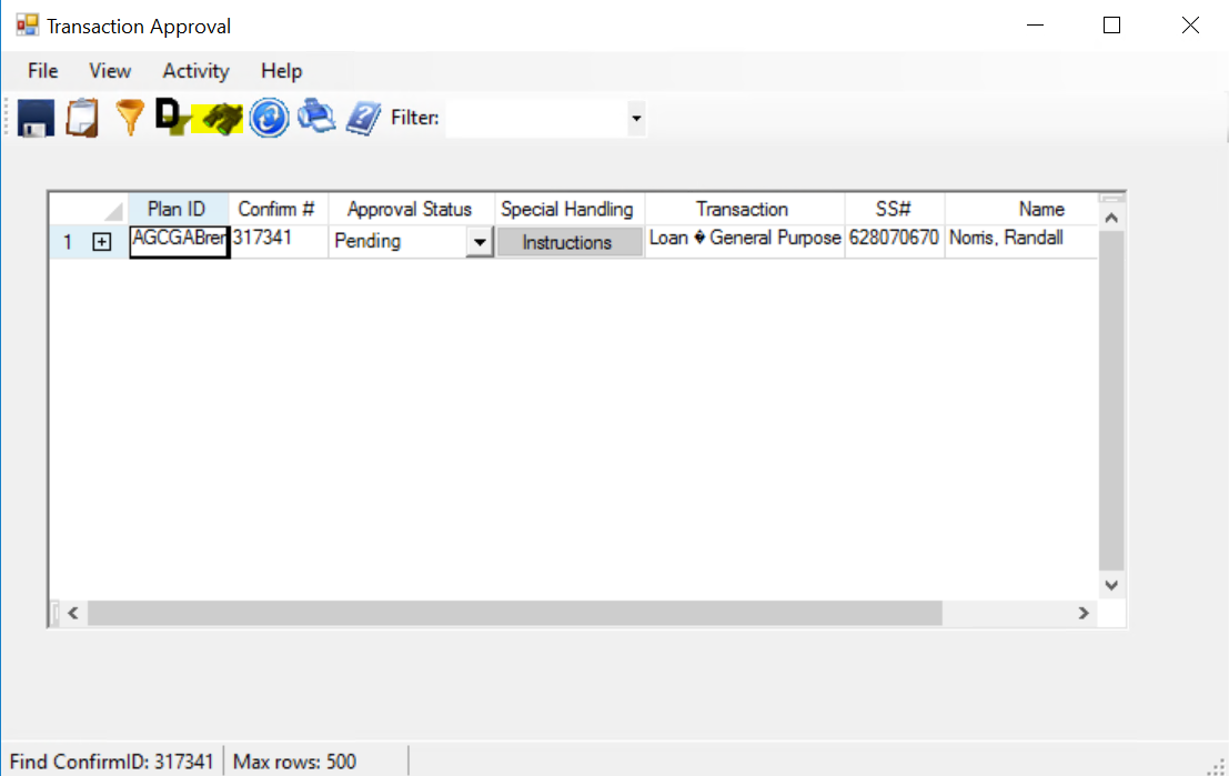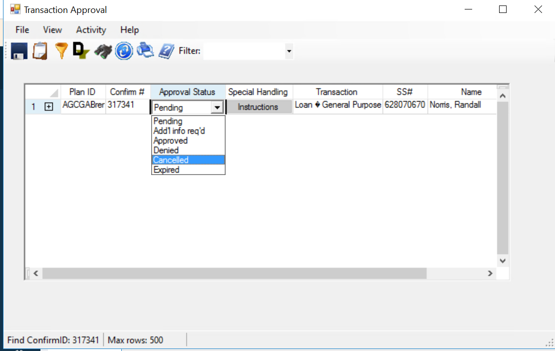 2) Any loans that have "Loans for Hardship Only" selected in the details tab or the loan type is "Residential" would need to be cancelled in Transactions Approval in Relius by following the below steps if the request has not been approved by the sponsor as of yet. Always ensure to save changes.