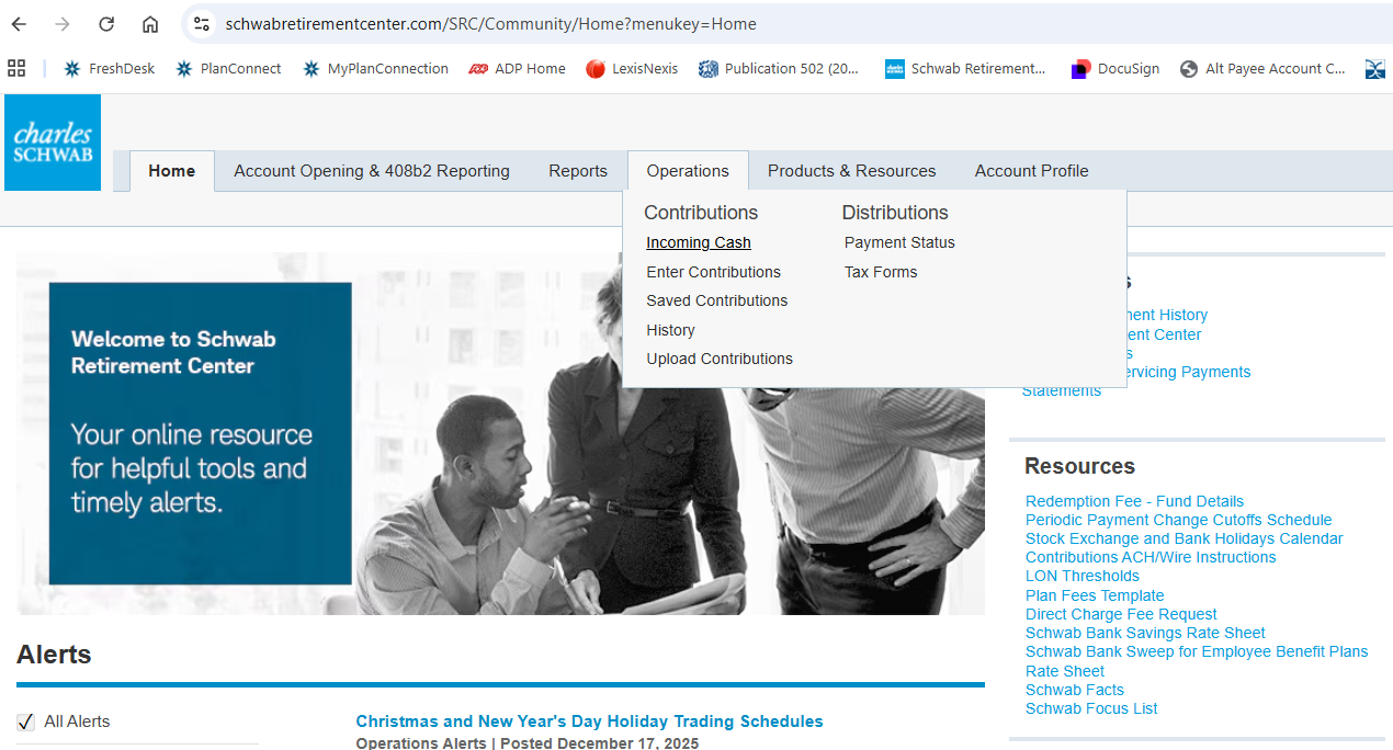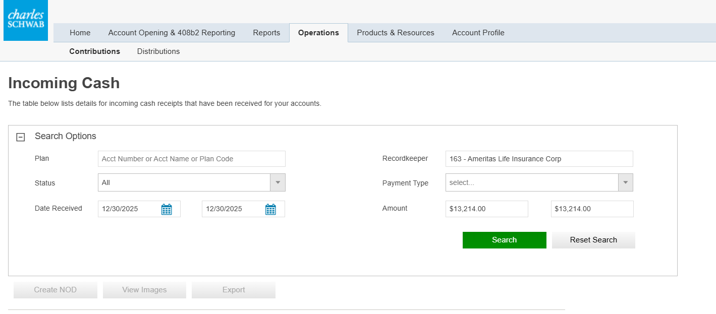 - On the Schwab website, navigate to Operations > Incoming Cash to search for check image.